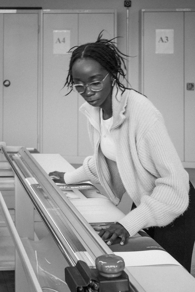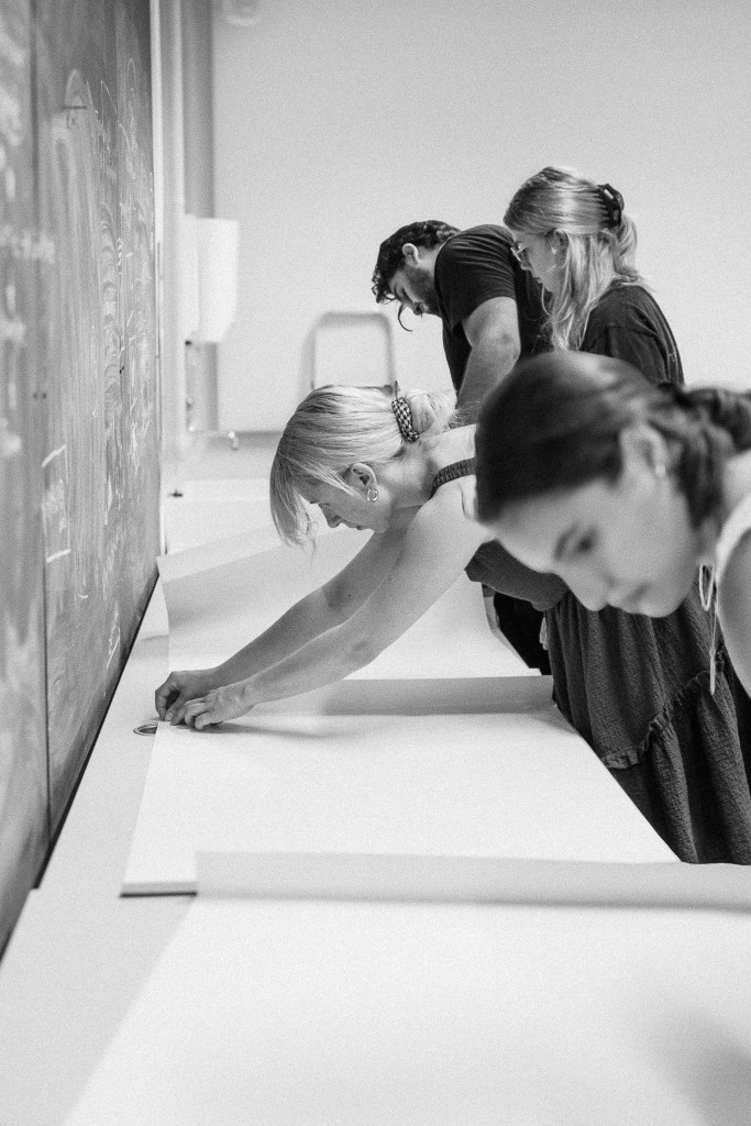For the final exhibition, she developed a room plan and guided students in adapting their work into posters. Using a new hanging system, the posters were suspended from the ceiling, creating an engaging spatial experience that showcased all contributions equally.